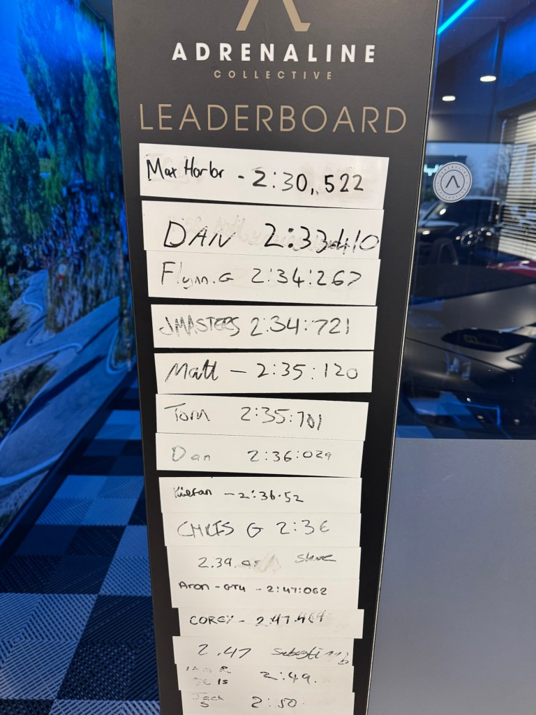 Thirdly was a visit to Adrenaline Collective to look around their cars. Max jumped on their sim and put a time around Spa that topped their leaderboard.